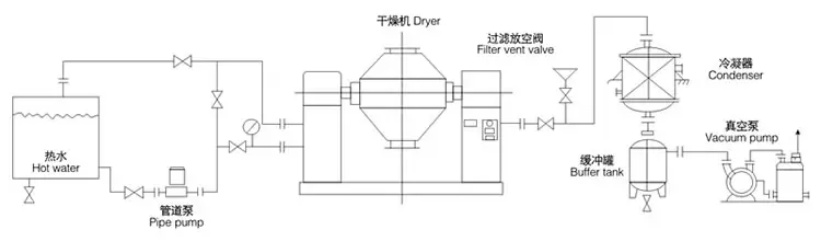 适用化工、制药、食品等行业的粉状、粒状及纤维状物料的浓缩、混合、干燥及需低温干燥的物料(如生化制品等),更适用于易氧化、易挥发、热敏性、强烈刺激、有毒性物料和不允许破坏结晶体的物料的干燥。安装示意图