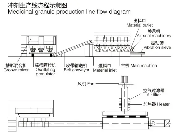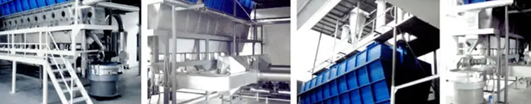 沸腾干燥,又称流化床,它是由空气过滤器、加热器、沸腾床主机、旋风分离器、布袋除尘器、高压离心风机、操作台组成,由于干燥物料的性质不同,配套除尘设备时,可按需要考虑,可同时选择旋风分离器、布袋除尘器,也可选择其中一种,一般来说比重较大的如冲剂及颗粒物料干燥只需选择旋风分离器,比重较轻的小颗粒状和粉状物料需配套布袋除尘器,并备有气力送料装置及皮带输送机供选择。