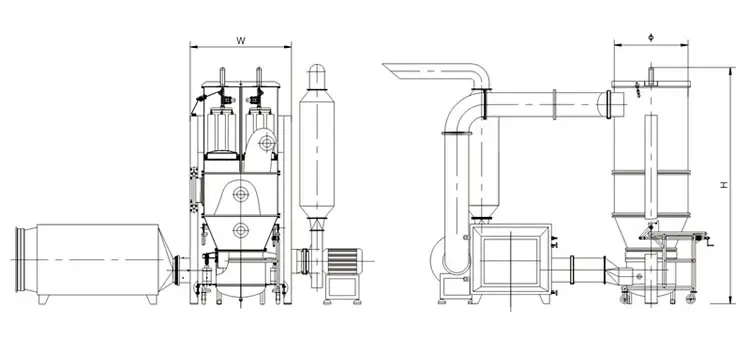 该机由主机、空气处理系统、加热系统、控制系统等组成。工作时,物料加入沸腾干燥机的料仓,按工艺要求设定程序和参数,整机开始工作。空气经过空气处理系统过滤、经加热系统加热后进入主机内,物料经热空气流化、干燥,水份迅速蒸发,物料被快速干燥。按设定的程序与参数完成操作后,将料仓推出与YTZJiuyou 9(中国)固定提升转料机扣合提升出料或利用真空上料器抽到高位整粒机整粒,有效地控制粉尘与交叉污染。