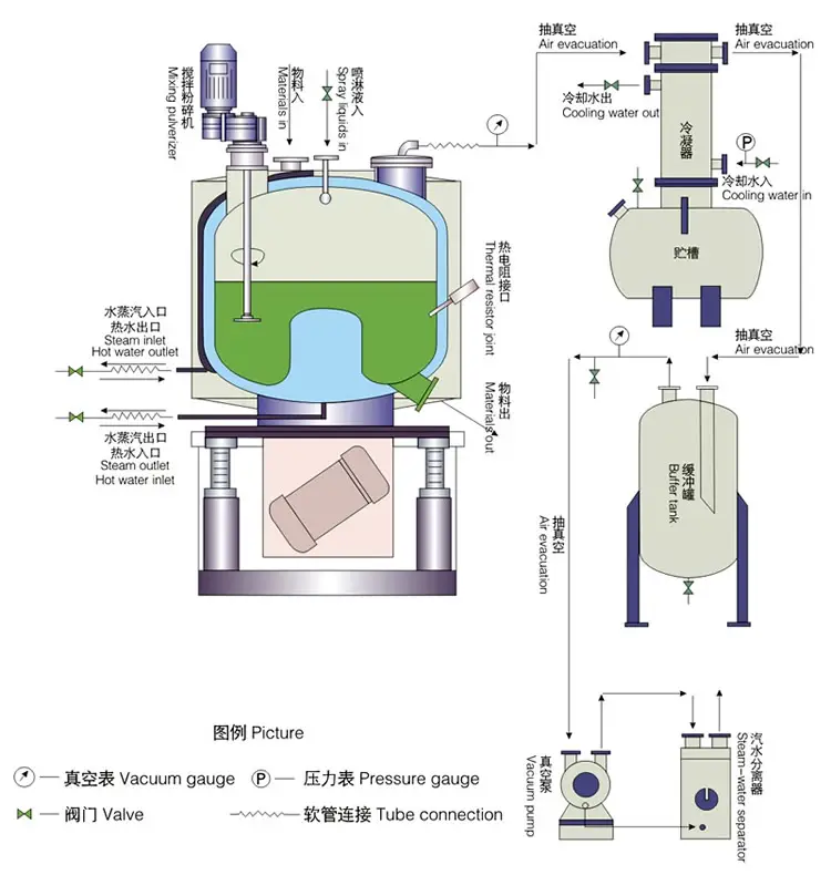 本机主要依靠来自容器底部的激振器所产生的机械振力和激振力矩,使容器产生周期性的振动。由于容器底部为一圆环形状,各点的振幅不一,使容器内的物料即围绕容器中心轴线公转,又绕圆环中心翻滚,合成环形螺旋运动,从而达到流化状态。流化物料与夹套加热的容器内壁接触传热升温,达到汽化点后在真空下水份汽化外排,致使物料快速脱水干燥。流程图