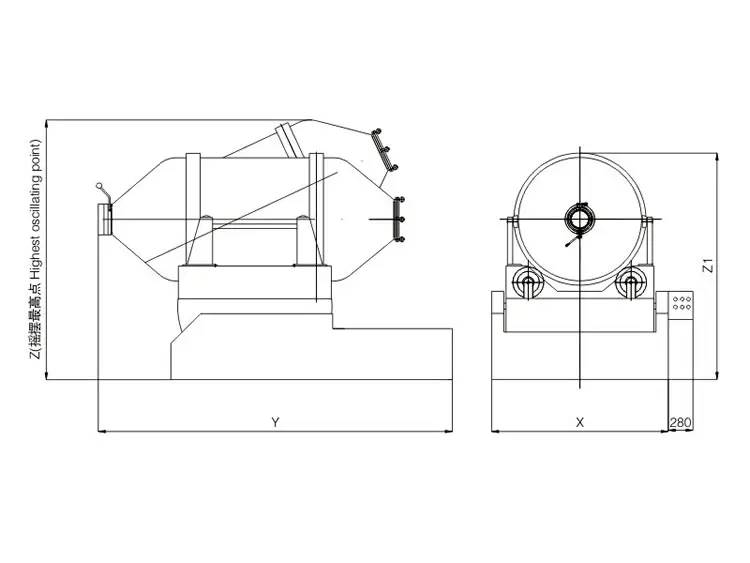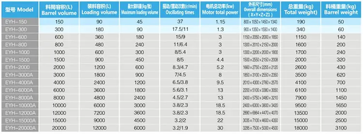 EYHJiuyou 9(中国)二维运动混合机的转筒可同时进行二个运动,一个为转筒的转动,另一个为转筒随摆动架的摆动。被混合物料在转筒内随转筒转动、翻转、混和的同时,又随转筒的摆动而发生左右来回的掺混运动,在这两个运动的共同作用下,物料在短时间内得到充分的混合。EYH二维混科机适合所有粉、粒状物料的混合。外型示意图