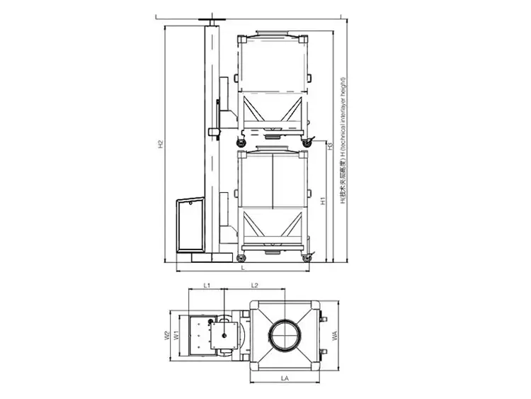 该机主要由底盘、立柱、提升系统等部件组成。工作时,先将装有物料的料斗推入料斗提升机的提升叉架上,然后启动提升按钮,料斗做提升运动,料斗到位后转动底盘与加料的设备密闭对接,开启出料蝶阀,使物料密闭转移到下一工序。