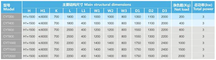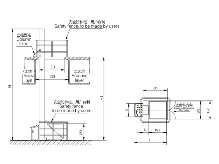 该机主要由底盘、立柱、提升系统等部件组成。工作时,先将物料装入或料斗推入提升平台上,然后拄下提升按钮,平台提升,平台到位后搬出物料或推出料斗到所需的位置。