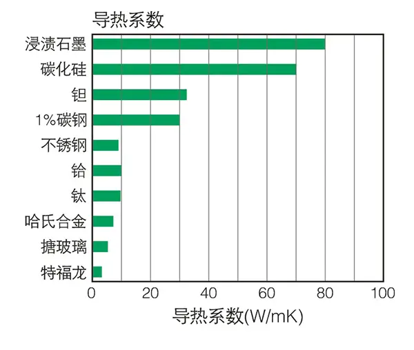 碳化硅的导热系数几乎通常使用的石墨管的导热系数相当,而且远比其它材料的导热系数高。它的导热系数是钽导热系数的2倍,是不锈钢导热系数的5倍,10倍于哈氏合金的导热系数,15倍于搪玻璃的热导系数。高效的导热系数,使碳化硅换热器具有高效节能的特点,同时大大缩小了对换热面积的需要。